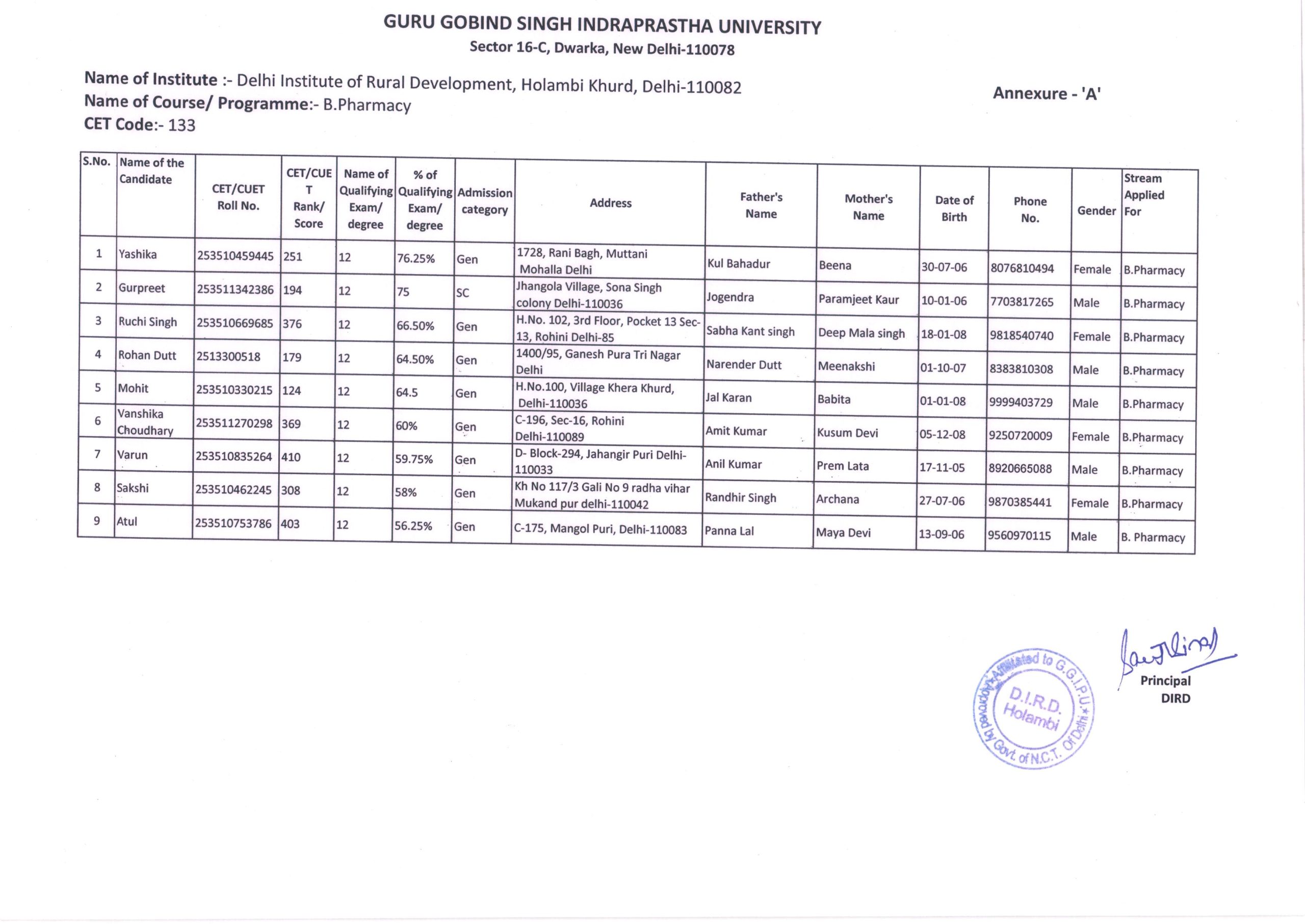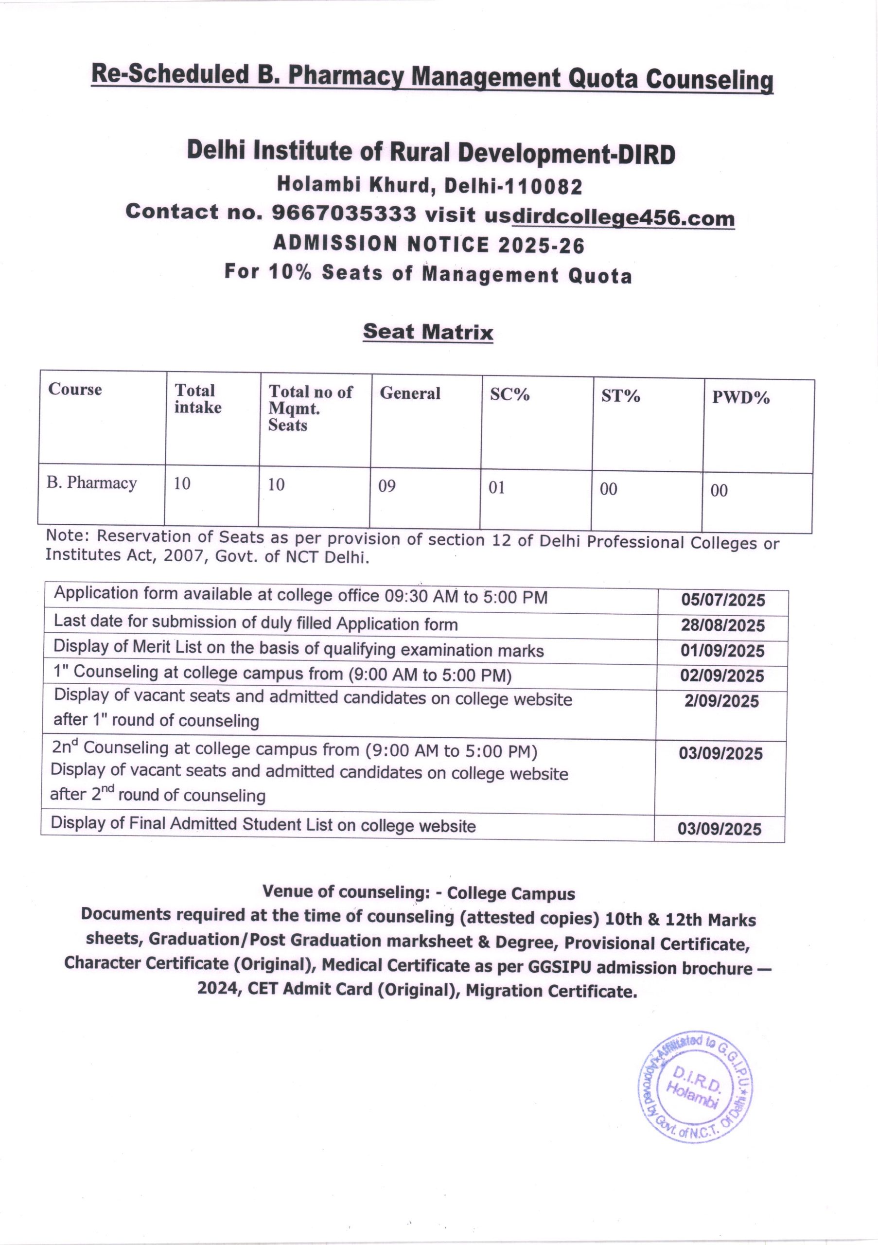 Admission Notification Management Quota Notice & Schedule for Addmission in Management Quota DIRD Holambi Khurd, Delhi 2025-2026 Online Admission Form for Management Quota DIRD Holambi Khurd 2025-2026 Admission Form for Management Quota 2025-2026 Extended Schedule for Admission in of Management Quota 2025-26 List of student applied in management quota 2025-26 during 1st round of Couselling B.Pharmacy Programme Admitted List of student admiited in management quota 2025-26 during 1st round of Couselling B.Pharmacy Programme Vacant seats status after first round counseling for the admission uder Managment quota